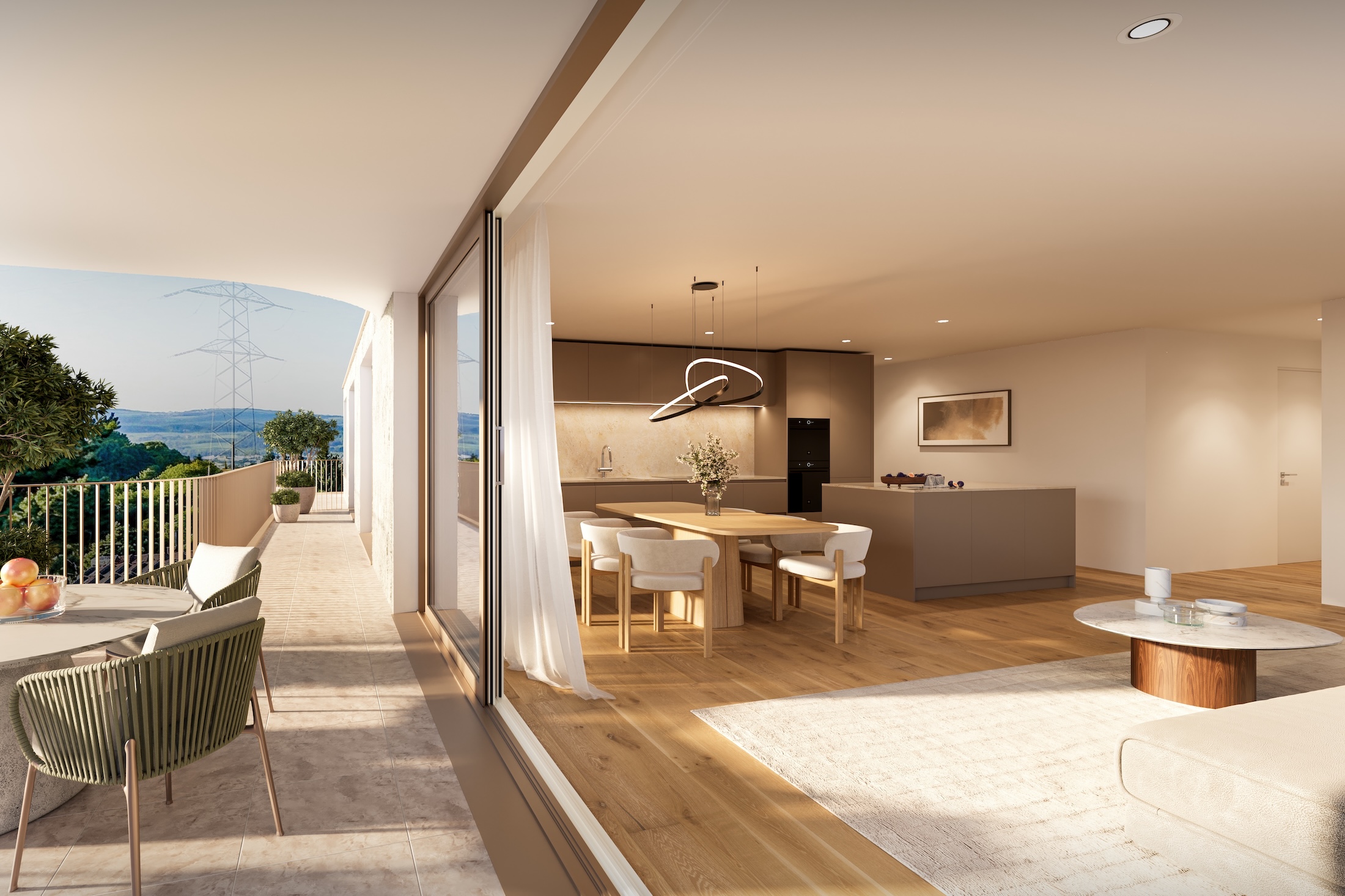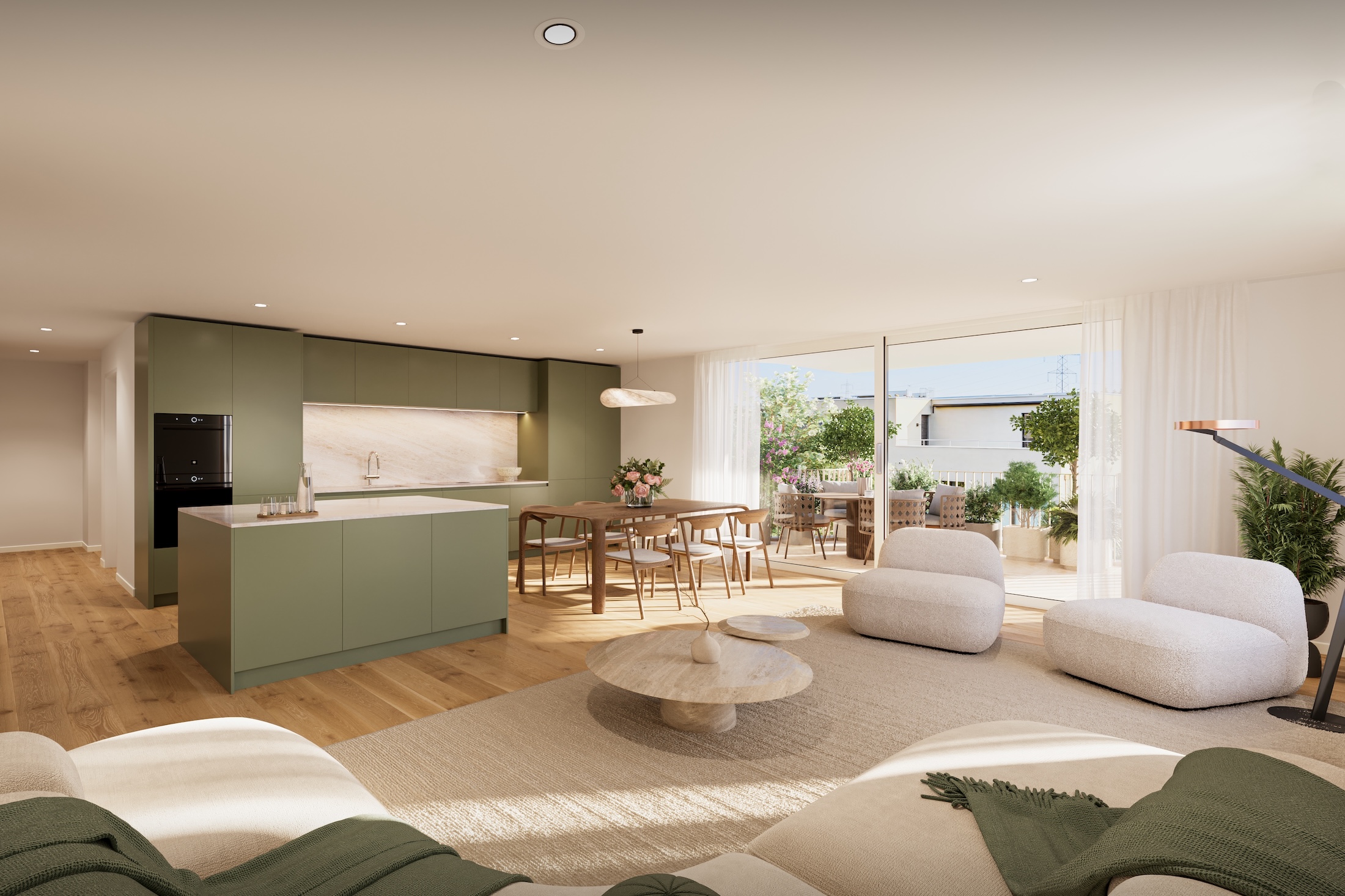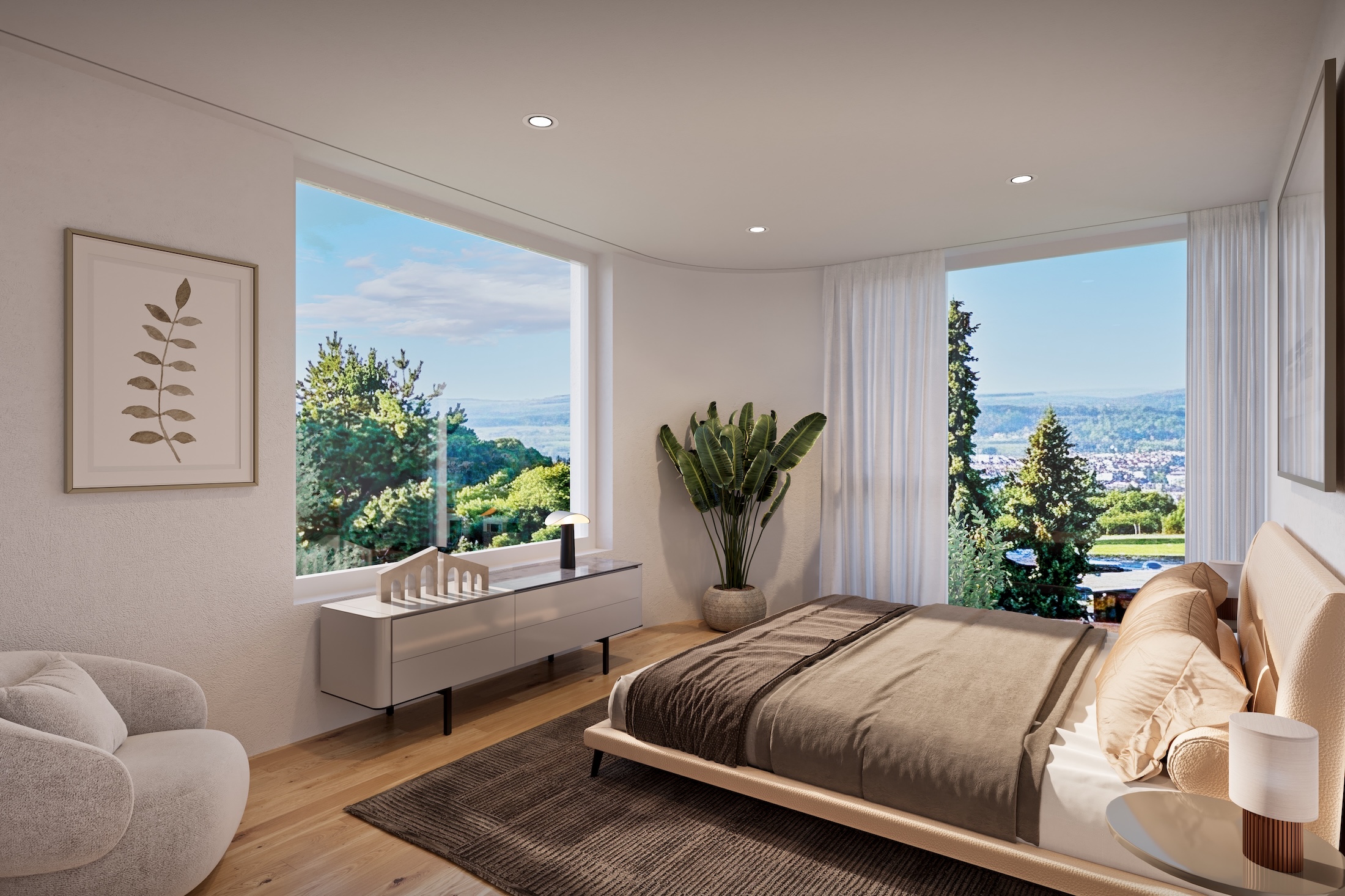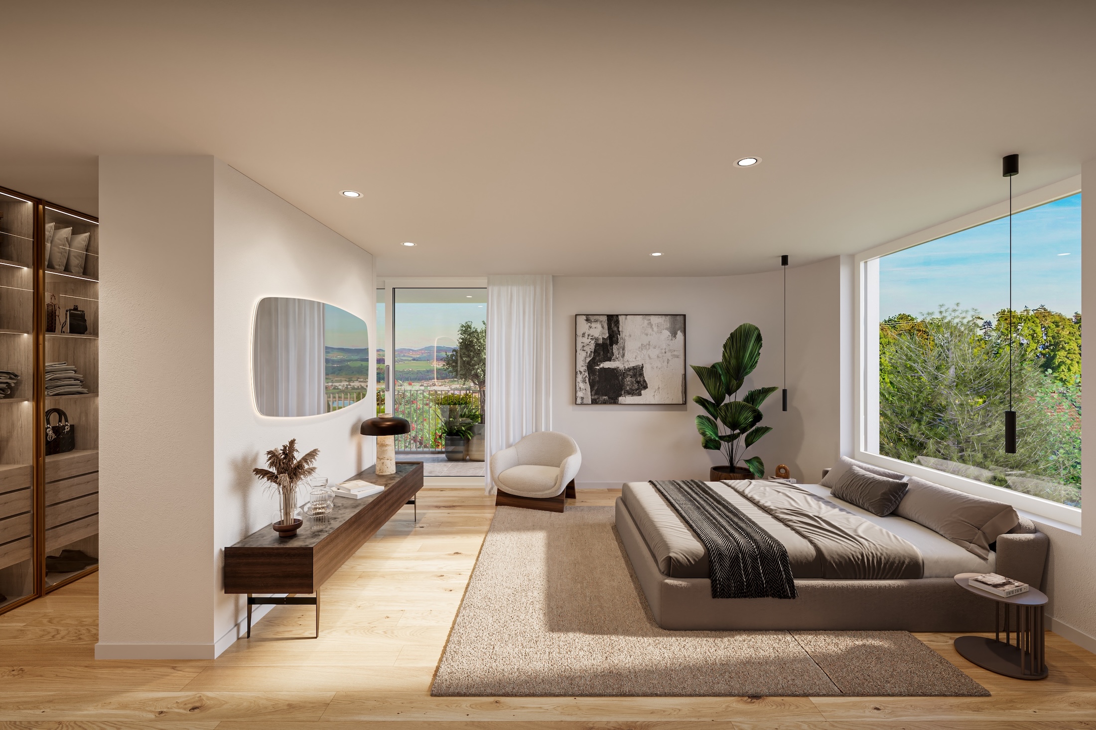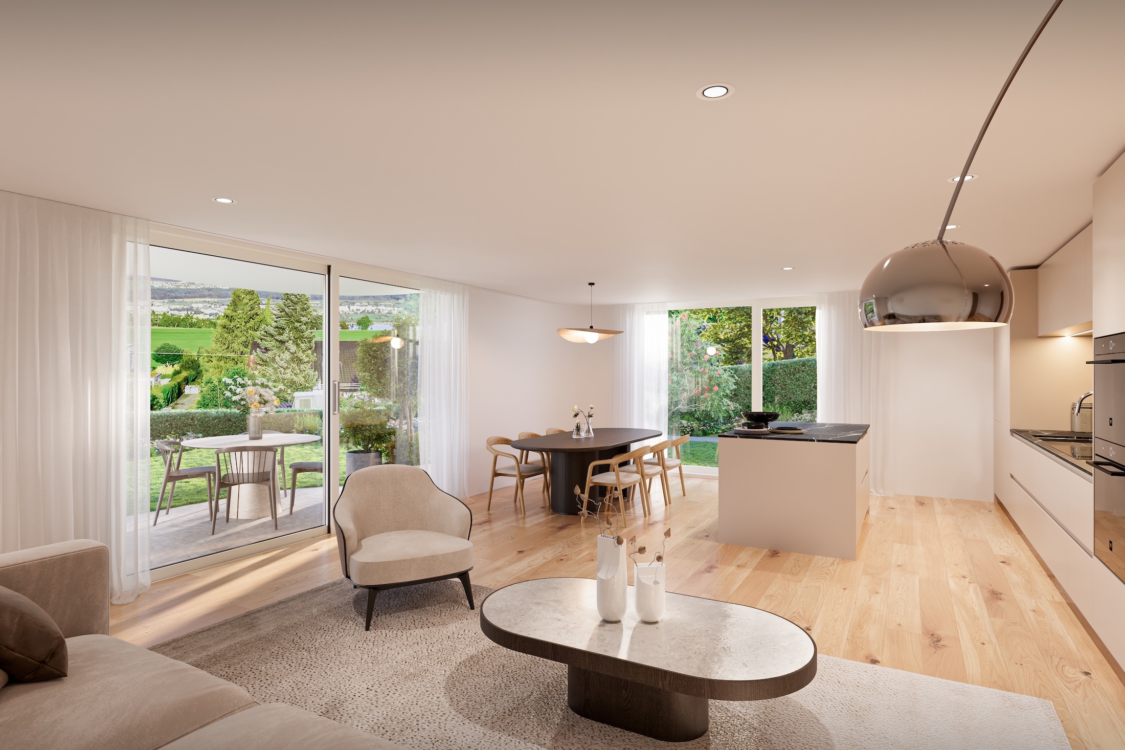 Das Projekt bietet durchdachte Grundrisse sowie helle Räume, die viel Platz zur Entfaltung lassen. Die 3.5- bis 5.5-Zimmer-Wohnungen sind mit jeweils zwei stilvollen Nasszellen ausgestattet. Grosszügige Fensterflächen sorgen für lichtdurchflutete Innenräume und einen Ausblick ins Grüne. Jede Wohnung verfügt zudem über einen eigenen Waschturm. Ein Lift verbindet alle Geschoss und garantiert einen schwellenfreien Zugang zu allen Wohneinheiten.